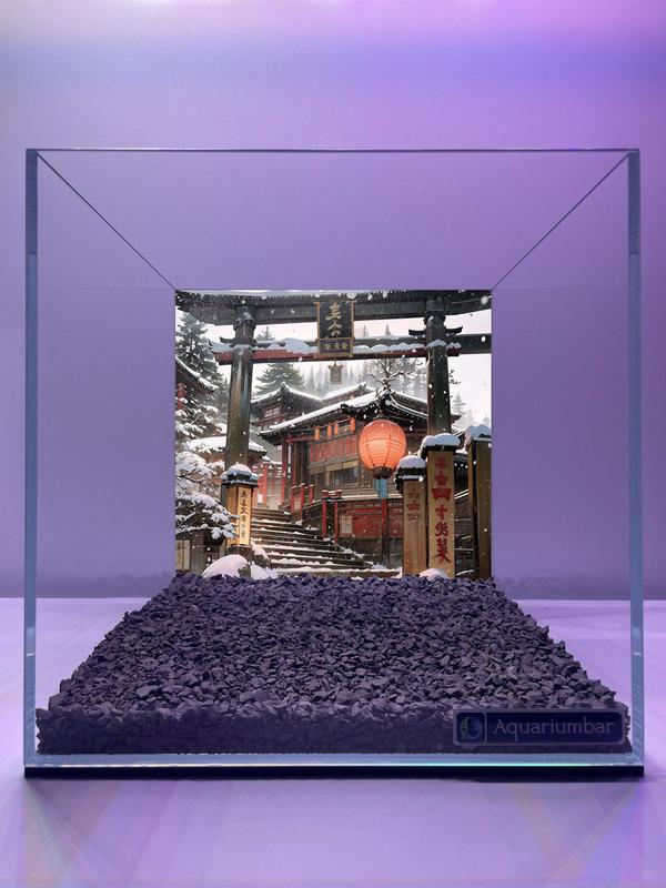 На изображении изображён аквариум, внутри которого видна зимняя сцена японского городка, выполненная в виде цифрового рисунка. Композиция сцены представлена в виде миниатюрного японского городка, вид спереди, находящегося внутри аквариума. Сцена изображает зимние пейзажи, покрытые снегом, традиционные японские ворота и фонари. Есть также тротуарные ступени и здания, создающие впечатление зимнего японского городка. Фон изображает небольшое, среднее по размеру расстояние. Внешние края фотоснимка аквариума мягко подходят к окружающему цвету. Главными элементами являются миниатюрный зимний японский пейзаж, созданный в стиле аниме. В сцене присутствуют японские ворота, фонари и здания. Все детали аккуратно детализированы, с четкими контурами и реалистичными тенями. Пейзаж выглядит очень аккуратным и тщательно проработанным. Используется цифровое средство, стилизованное под аниме. Иллюстрация исполнена в стиле аниме, с использованием плавных линий и ярких цветов, что придает изображению реалистичный вид. Стиль изображения показывает, что это профессионально выполненная работа с применением цифровых методов. Цвета насыщенные и хорошо согласованы. В качестве фона используется зимняя сцена японского городка. Освещение на изображении представлено в виде мягкого света, создавая атмосферу, которую можно описать как заснеженную и уютную. Вся сцена хорошо освещена, что придает реалистичность зимним пейзажам.