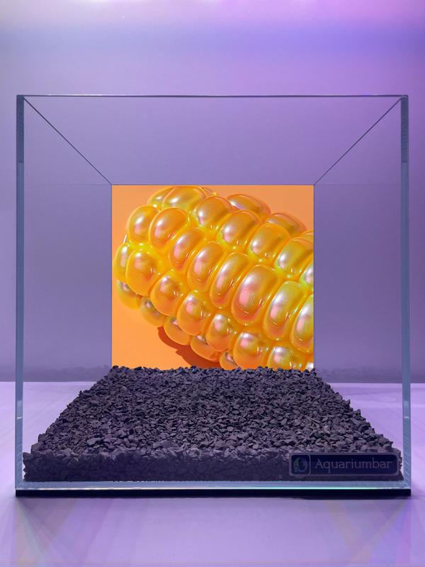 Изображение представляет собой аквариум, в котором размещена искусственная кукуруза ярко-оранжевого и золотистого цветов с переливами. Стиль изображения -- современный, стилизованный под цифровое 3D-моделирование с использованием ярких неоновых цветов. Кукуруза имеет объемную, почти глянцевую текстуру, похожую на полированный пластик или смолу. Аквариум представлен в виде прозрачной стеклянной емкости с темным грунтом. Цветовая палитра ограничена и состоит из оранжевых, золотых и фиолетовых оттенков, которые контрастируют с черным грунтом аквариума. Нет явных соответствий с известными художниками или конкретными художественными направлениями, за исключением возможной стилизации под современный дизайн. Композиция снимка простая и направлена на демонстрацию внутреннего пространства аквариума. Средство изображения -- фотография, сделанная, вероятно, с использованием искусственной подсветки.