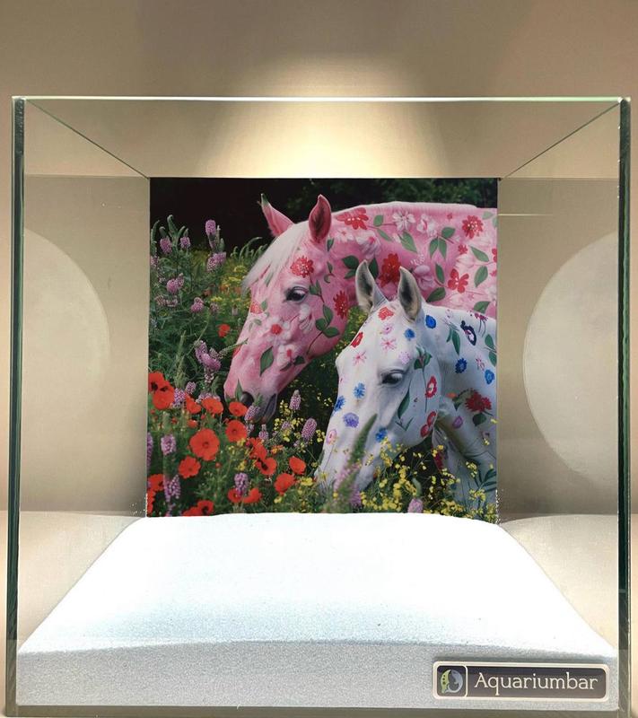 Изображение представляет собой фотопечать двух лошадей, украшенных цветными узорами из цветов. Стиль изображения напоминает коллаж, где на изображениях лошадей нанесены цветочные узоры. Цветовая палитра яркая и насыщенная, включающая розовые, белые, синие, желтые и красные оттенки. Композиция сосредоточена на лошадях, которые находятся на фоне цветущего луга с полевыми цветами. Изображение выглядит как отдельный дизайн, возможно, для аквариума или подобной среды. Техника нанесения красок на изображения выглядит профессиональной и детальной, сохраняя при этом жизнерадостный характер. Средство нанесения, возможно, является цифровым, или это печать, поэтому нет видимых штрихов кисти.