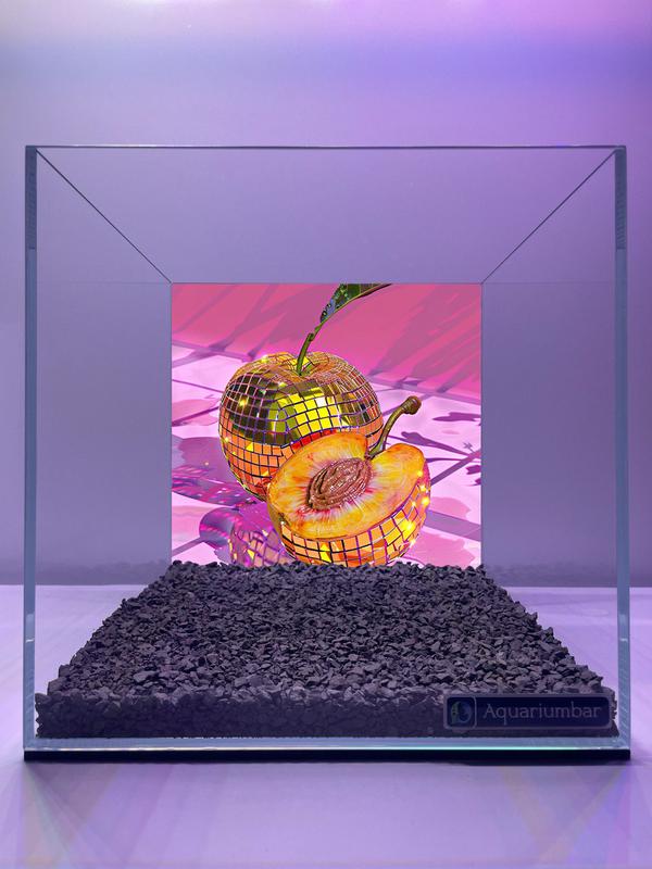 Изображение представляет собой аквариумную установку, в которой изображение двух персиков, словно находящихся в интерьере, занимает центральное место. Персики и яблоко стилизованы с применением мотивов диско-шаров, создающих эффект отражения и блеска. Цвета - яркие и насыщенные, в основном представлены оттенки розового, золотого и оранжевого. Стиль изображения можно отнести к цифровому искусству, вероятно, созданному с помощью компьютерной программы. Композиция сфокусирована на объектах, что указывает на направленность внимания на персики и яблоко как на главные элементы. Материал изображения -- не традиционное полотно, а изображение на цифровом носителе (экране), помещенное в аквариум.