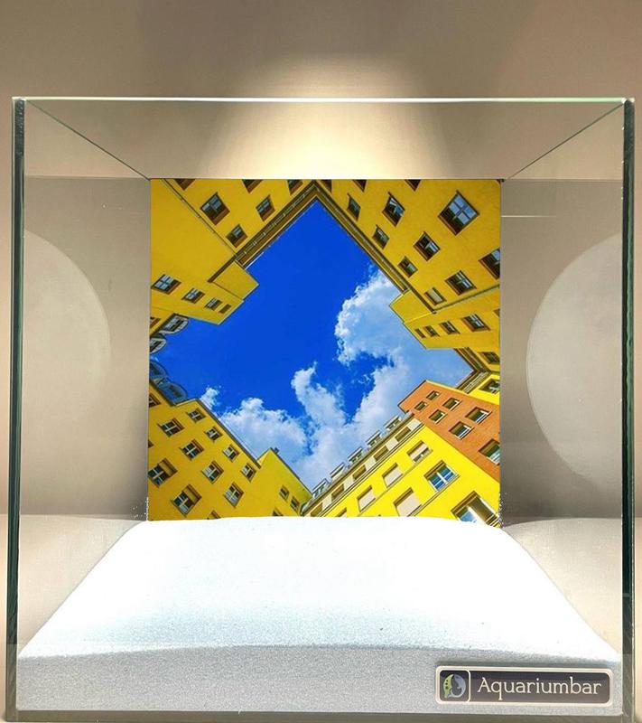 На изображении представлен аквариум с фотографией желтых зданий, расположенных на фоне голубого неба с облаками. Композиция изображения построена таким образом, что фото зданий расположено в аквариуме, а нижняя часть -- это слой белой наждачной бумаги. Фотография желтых домов создаёт атмосферу города, где много света, голубого неба и облаков. На фото изображены здания разных оттенков желтого, оранжевого и коричневого цветов. На фото изображены только здания. Фотография сделана в виде фотографии, затем напечатанной и помещённой в аквариум. Фотография имеет высокую детализацию и чёткость. В аквариуме установлена белая наждачная бумага. Светлое освещение и вид неба создают атмосферу уюта и спокойствия. В целом, фотография аквариума передаёт атмосферу спокойствия и умиротворения.