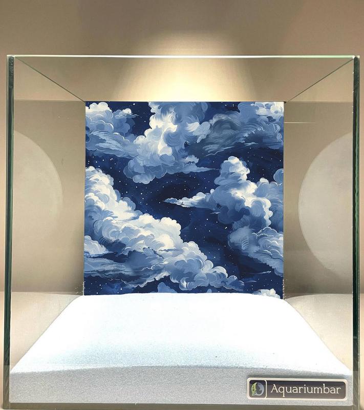 В аквариуме с прозрачными стенками изображена картина ночного неба с облаками, выполненная в сине-белых тонах. Композиция картины представляет собой изображение ночного неба с облаками. Облака различной формы и размеров занимают большую часть картины, а небо -- глубокий синий. Картина имеет простую композицию, которая фокусируется на изображении облаков. Изображение имеет симметричное расположение элементов. Облака разбросаны по небосклону. Небо и облака создают гармонию и умиротворение. На картине изображены облака различных форм и размеров, окрашенные в различные оттенки синего и белого. Облака плавно перетекают друг в друга, создавая ощущение движения и глубины. На картине есть небольшие точки, которые представляют собой звезды. Облака занимают большую часть картины, заполняя собой небо. Художественный стиль картины -- живопись. Стиль изображения мягкий и плавный. В работе есть проработанные детали и четкие линии. Цвета на картине неяркие, но гармоничные. Используемые цвета создают атмосферу спокойствия и умиротворения. На картине используется мягкое цветовое сочетание сине-белых тонов, которое усиливает чувство спокойствия. Внутри аквариума на дне расположена голубоватая галька или песок, а на фоне изображены облака. На верхней части аквариума нет никаких деталей. Светильники отсутствуют, но есть светлое освещение. Общая атмосфера картины спокойная и тихая.