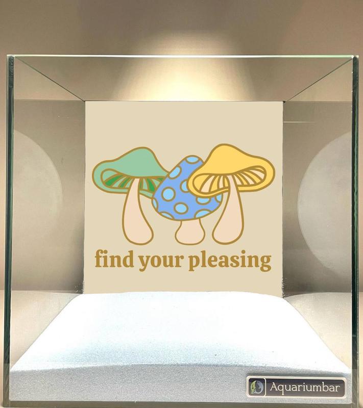 На бежевом фоне в стеклянной коробке изображены три разноцветных гриба с текстом "найдите свое удовольствие". Композиция изображения простая и симметричная. Три гриба расположены по центру, и они составляют центральный акцент изображения. Они симметрично расположены в равной степени по отношению к центру. Текст "найдите свое удовольствие" написан под грибами, и он также расположен по центру изображения. Цвета грибов нежные и пастельные -- салатовый, голубой с точками и желтый. На изображении изображены только три гриба с белым/кремовым фоном. Нет других элементов дизайна или визуальных компонентов. Иллюстрация проста, но приятна глазу. Иллюстрация выполнена в стиле ретро. Цвета грибов пастельные, а фон бежевый. Стиль иллюстрации милый и дружелюбный. Изображение расположено в стеклянной коробке, на нижней части которой есть логотип Aquariumbar. Внутри коробки находится слой светлого серого материала, похожий на песок. Это создает ощущение уюта и покоя. Освещение нейтральное и мягкое, без резких теней. Общее настроение спокойное и расслабляющее.