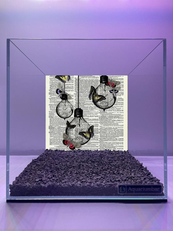 На изображении представлен аквариум, украшенный печатью старинной книги с изображением лампочек и бабочек. Композиция изображения представляет собой аквариум с декоративной печатью на дне. На печати расположены несколько лампочек, из которых вылетают бабочки разных цветов и размеров. Изображение имеет четкую фокусировку, которая делает фоновые элементы размытыми, чтобы акцентировать внимание на висящих предметах. Печать размещена в центре аквариума, в целом создавая эффект глубины изображения. На переднем плане видны камни, которые покрывают дно аквариума. Эти камни имеют темный, почти темно-серый цвет. Поверх камней нанесено изображение, состоящее из слов и иллюстраций. Изображение имеет классический вид, стилизованный под старинные книги, с оттенками серого, бежевого и розового. Изображение выполнено в технике графического дизайна, что создаёт ощущение старинной печати. Иллюстрации изображены в технике, имитирующей гравюру. Цветовая гамма изображения спокойная и неяркая, использует нейтральные тона, что создает ощущение спокойствия и умиротворения. В качестве фона использован аквариум, создавая впечатление, что изображение напечатано на стекле. Вокруг печати аквариума присутствует пурпурный фон. Это создает атмосферу таинственности и способствует сосредоточению зрителя на изображении на дне аквариума.