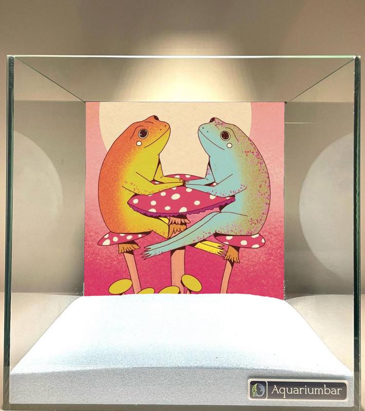 На картинке изображены две лягушки, сидящие на красных грибах с белыми точками. Композиция изображения симметричная, две лягушки расположены друг напротив друга, словно беседуют. Лягушки сидят на грибах, которые занимают центральное место на изображении. Лягушки размещены в центре картинки, а грибы занимают всю середину, что создает ощущение баланса. Изображение в целом статичное и спокойное, без каких-либо активных действий. В рамке на изображении изображены две лягушки, сидящие на красных грибах с белыми точками, которые похожи на маленькие столики. Они выглядят дружелюбно и спокойно, словно ведут беседу. Изображение имеет приятные цвета, но не выделяется динамикой или активностью. Главными объектами изображения являются две лягушки. Одна лягушка оранжевого цвета, другая голубого. У обоих лягушек большие глаза и мягкие черты лица, которые придают им дружелюбный вид. Оба животного сидят в спокойных позах, держа руки в соединенном положении. Грибы под лягушками имеют насыщенно- красный цвет с белыми точками, а их ножки выглядят реалистично. Изображение выполнено в стиле графического дизайна, с яркими цветами и простыми формами. Рисунок имеет плоский стиль, в котором цвета переходят друг в друга плавно, без переходов, как в традиционном анимированном стиле. Цветовая гамма изображения спокойная и приятная, с преобладанием пастельных тонов. Стилистически изображение напоминает работы, выполненные в цифровом стиле или векторном формате. Изображение происходит в вымышленной среде, вероятно, в лесу, или воображаемой области. Фон имеет розовый оттенок, который подчеркивает дружелюбную атмосферу, созданную изображениями. Небо на заднем плане светлое и мягкое, с акцентом на центральных фигурах, словно освещенных мягким светом. Свет мягко падает на лягушек, не создавая резких теней, что создает ощущение уюта и спокойствия. Общее впечатление - приятная, спокойная и милая атмосфера.