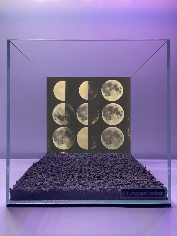 Изображение представляет собой аквариум с прозрачными стенками. На внутренней поверхности аквариума изображена графическая иллюстрация лунных фаз на черном фоне. Цвет фона и изображение лун создают спокойную и атмосферную обстановку. В аквариуме присутствует слой темного, мелкого гравия. Стиль изображения -- графический, без видимой импасто или других сложных художественных приемов. Цвет -- преимущественно черно-серый с вкраплениями серого. В целом, композиция проста и направлена на демонстрацию изображения лунных фаз в аквариуме. Используемый материал -- аквариумное стекло и гравий.
