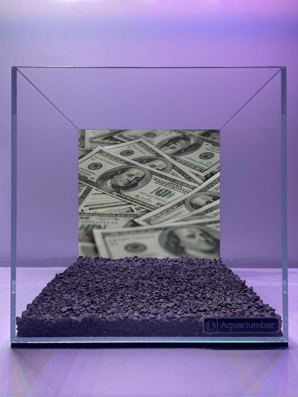 Изображение представляет собой аквариум с прозрачными стенками, наполненный фиолетово-серым гравием. На задней стенке аквариума напечатан принт с изображением множества стодолларовых банкнот. Стиль изображения можно охарактеризовать как современный, минималистичный. Цветная палитра в основном фиолетовая и серая, создающие спокойную и нейтральную атмосферу. Композиция акцентируется на контрасте между прозрачностью аквариума и разнообразием изображений на задней стенке. Материал изображения - цифровое изображение, напечатанное на задней стенке аквариума, и стекло.