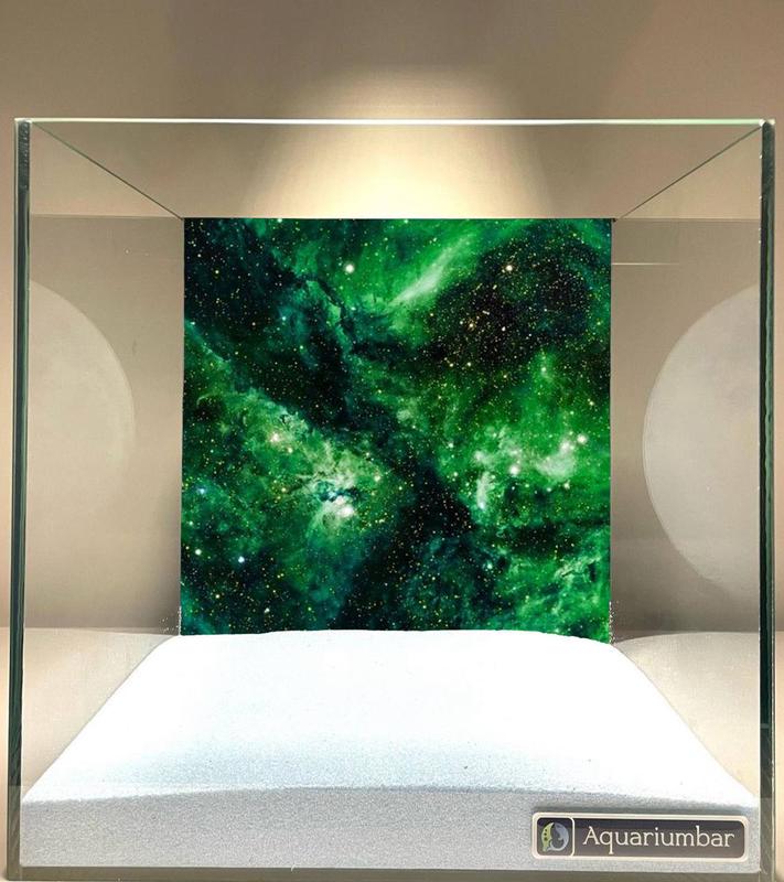 Изображение представляет собой аквариум с декоративной внутренней поверхностью, имитирующей космическую туманность. Стиль изображения - фотореалистичный, с фокусом на создании достоверного визуального представления космической туманности. На изображении преобладает зеленовато-голубой оттенок, имитирующий космос, с множеством звёзд разной яркости. Текстура ровная, без выраженных мазков или кистевых штрихов. Композиция изображения соответствует пространству аквариума. Средство -- фотография или цифровая обработка изображения.