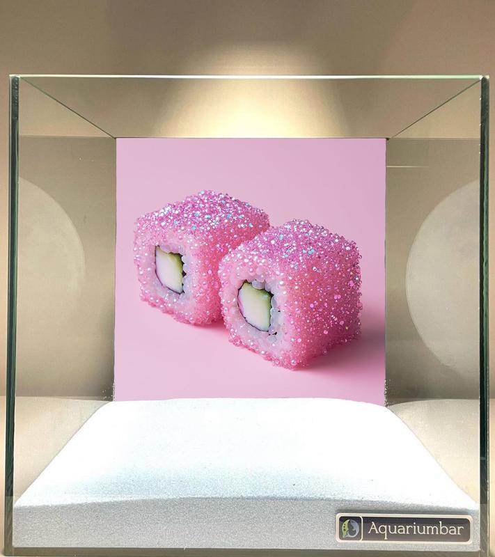 В стеклянном аквариуме с розовым фоном изображены два розовых суши-ролла, покрытые блестками. Композиция изображения простая и фокусируется на двух суши-роллах, которые занимают центральную часть розового фона. Суши-роллы размещены симметрично друг относительно друга, на белом фоне, создавая визуальный акцент. В изображении нет действия или взаимодействия. Рамка изображения четкая и не включает никаких других элементов, помимо самих роллов. Главными объектами на изображении являются два розовых суши-ролла. Роллы представляют собой ровные, аккуратные куски, покрытые розовыми блестками, создавая эффект глазури. Видно, что внутри роллов находятся белые наполнители. Позиционирование роллов позволяет сосредоточиться на их форме, цвете и блеске. Художественное оформление изображения -- это современное цифровое фото с акцентом на блестящих розовых суши-роллах. Изображение выполнено профессионально, с четким изображением и точными контурами. Цветовая палитра ограничивается розовым, белым и блестками. Стиль изображений ясен, так как он фокусируется на создании яркого и привлекательного изображения. Изображение создано в аквариуме со стеклянной рамкой. На заднем плане - розовый фон, а на переднем - белое, словно песчаное, основание. Свет равномерно распределен по всей поверхности, создавая эффект без теней, создавая гармоничную и ровную цветовую палитру. Общее настроение изображения -- современное, праздничное, милое, сфокусированное на блестящих суши-роллах.