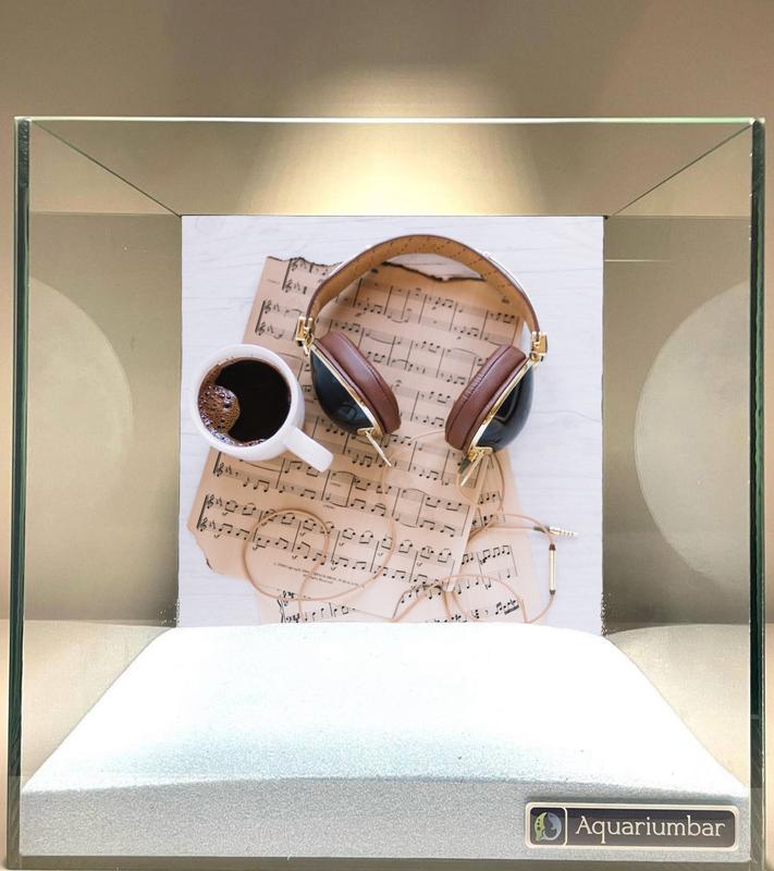На фото изображена композиция в аквариуме, представляющая собой сцену с наушниками, чашкой кофе и нотами. Композиция представлена в виде прямоугольной рамки, в центре которой размещены наушники коричневого цвета, сложенные поверх старинных нот. Наушники лежат на некотором расстоянии от чашки кофе, в центре композиции. Аккуратный и не перегруженный дизайн. Фокус на предметах и отсутствие лишних элементов. Основным предметом изображения являются наушники, чашка кофе и нотные листы. Наушники имеют коричневую кожзаменитель, а чашка кофе белая. Нотные листы выглядят состаренными, создавая ощущение старины и ностальгии. Изображение выполнено в виде иллюстрации или фотографии, с минимальным использованием света и теней. Цветовая палитра спокойная и гармоничная, с преобладанием нейтральных тонов. Видно внимательное отношение к деталям, например, складки на обшивке наушников. Упорядоченность и организованность элементов сцены. В качестве фона используется мягкий бежевый или светло-коричневый оттенок. На дне аквариума виден слой светлого песка. Световой источник расположен сверху, что создает мягкую, не слишком резкую подсветку композиции. В целом преобладает спокойная, уютная атмосфера.