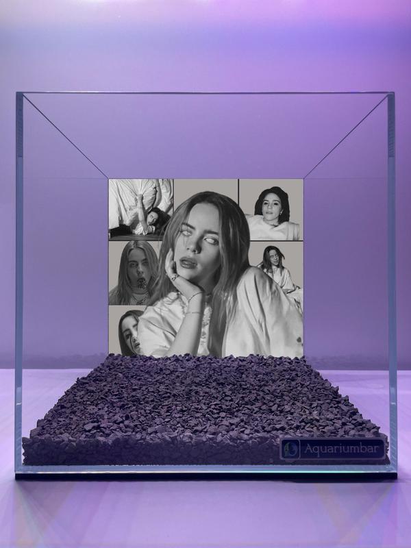 Изображение представляет собой аквариум, оформленный в виде витрины с мозаичным изображением. Внутри аквариума на стенах расположены несколько черно-белых портретов или изображений, которые, похоже, связаны между собой по стилю. Цветовая гамма представлена в основном оттенками фиолетового и серого, с использованием черно-белых изображений как акцентов. Композиция изображения является примером мозаичной техники, где несколько небольших изображений собираются вместе, создавая общее изображение. Общее впечатление от изображения -- современное, стилизованное. Нет явных признаков сходства с конкретными художниками или движениями. Материал изображения -- похоже, цифровое изображение на фотобумаге или программного обеспечения.