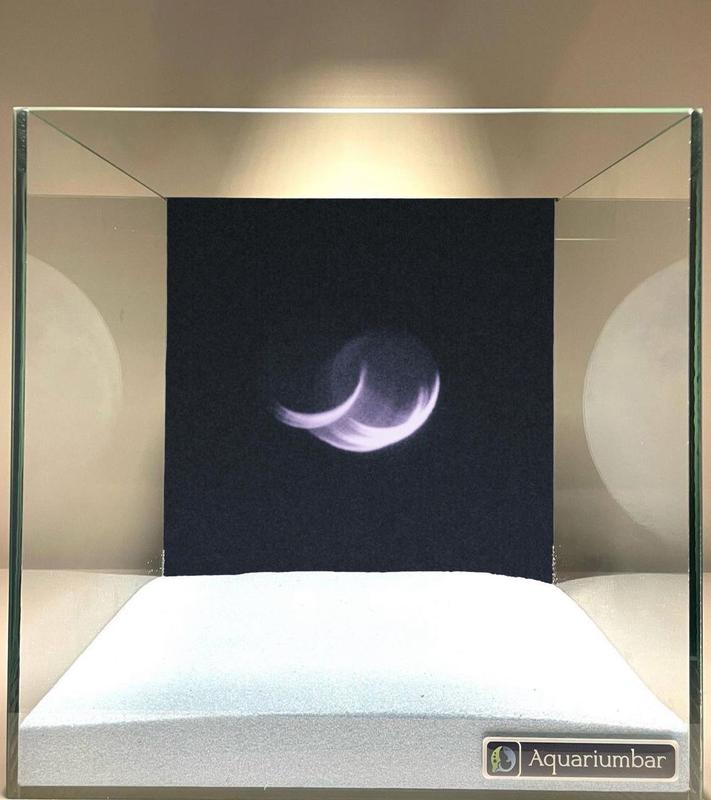 Изображение представляет собой фотографию аквариума. Внутри аквариума на темном фоне изображено нечто похожее на светящийся объект или силуэт, напоминающий луну или космический объект. Цветовая палитра включает в себя темные тона, светлые пастельные оттенки, создавая контраст. Поверхность аквариума и его внутренняя среда создают иллюзию пространства и глубины. Композиция сосредоточена на центре изображения, с акцентом на светящемся объекте. Средством является фотография, сделанная с помощью камерной техники.