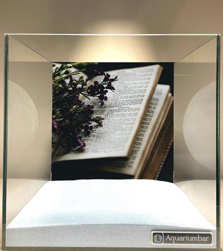 В тишине библиотеки времени, где пыль оседает не на вещах, а на забытых мыслях, стоит прозрачный куб. Он как аквариум для воспоминаний. Внутри -- не рыбы, не кораллы, а нечто гораздо более живое -- открытая старая книга. Ее пожелтевшие страницы хранят не только слова, но и дыхание тех, кто когда-то жадно поглощал ее строки при свете лампы. Буквы молчат, но они ждут -- читателя, который вдохнет в них новую жизнь. Рядом с текстом лежит веточка мелких фиолетовых цветов. Возможно, их оставил кто-то влюбленный, читая вслух отрывки о вечном. А может -- это память о том, кто так и не успел дочитать. Вся эта сцена -- в идеальной стеклянной коробке, под подписью «Aquariumbаr». Это не просто экспозиция -- это окно в чью-то душу, музей памяти, напоминающий: слова -- это свет, а каждая книга -- как океан, глубины которого открываются только тем, кто не боится нырять.