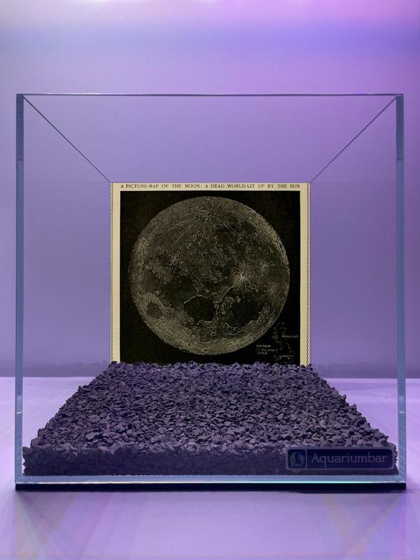 Изображение представляет собой аквариум с прозрачными стенками. Внутри аквариума находится изображение Луны, напоминающее старинную карту или графический рисунок. Цвет фона аквариума -- фиолетовый. На дне аквариума слой темного, гравия. Стиль изображения скорее научно-популярный, чем художественный. В качестве художественного приёма использован эффект старинного, графического изображения. Используется минимализм в оформлении. В качестве материала использован акрил или стекло для аквариума. Отсутствуют яркие детали, сосредоточенность на изображении Луны и гравия.