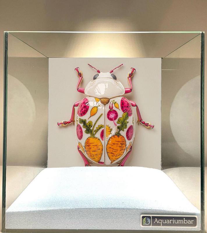 На изображении представлена детально проработанная художественная работа, изображающая жука. Художественный стиль, скорее всего, является сочетанием реализма и декоративности. Жук нарисован в ярких цветах, как розовом, красном, жёлтом, оранжевом, и белом. Изображение овощей и ягод на поверхности жука выполнено в деталях, что придает реалистичность. Отсутствие видимых особенностей стиля известных художников. Стиль рисунка напоминает декоративное изобразительное искусство, сосредоточенное на деталях, но в реалистичной манере. Средством, вероятно, является цифровая живопись или использование различных материалов, наносящих красочные и детальные картины на поверхности жука. Композиция - централизованная, направленная на детальное изображение жука. Обращает внимание на мастерство детальной проработки и реалистичного изображения различных элементов.