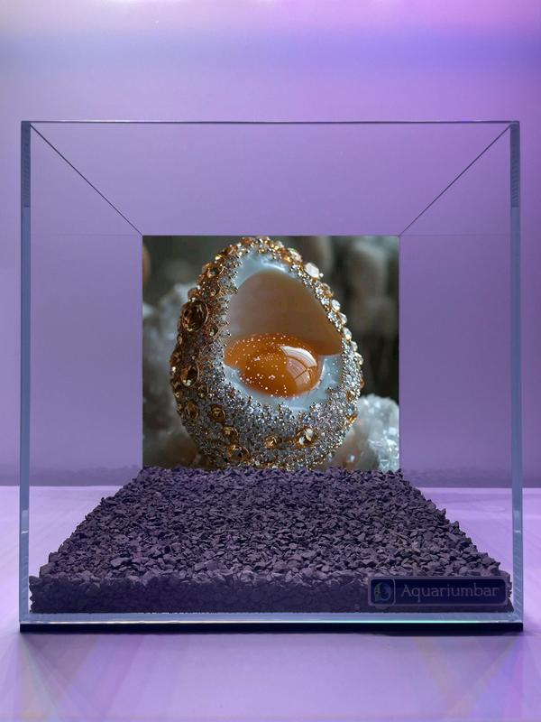 Зображення являє собою акваріум із декоративним оформленням. Усередині акваріума зображено яйце, прикрашене золотими та сріблястими коштовностями. Кольорова гама зображення включає в себе поєднання золотого, помаранчевого, сріблястого, сірого і фіолетового відтінків. Стиль оформлення нагадує скоріше арт-об'єкт, ніж традиційний живопис або малюнок. Немає явно вираженої техніки, таких як імпресіонізм або манга. Декоративне яйце має тривимірний вигляд, що створює враження витонченої роботи, прикрашеної дрібними деталями. Зображення оформлене в прямокутній прозорій рамці акваріума. Воно демонструє композицію, центровану на прикрашеному яйці, яке контрастує з темним ґрунтом на дні акваріума. Засіб зображення - цифрова фотографія або репродукція.