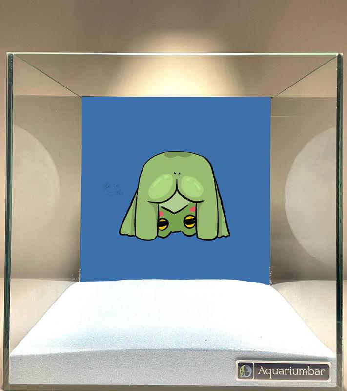 Изображение представляет собой цифровую иллюстрацию, стилизованную под анимационный или комикс-стиль. На синем фоне изображен лягушонок, выполненный в мультяшном стиле с яркими, простыми контурами. Цвет лягушонка - салатовый, а детали, такие как глаза и розовые пятнышки, добавляют ему выразительности. Стиль рисунка - упрощенный, с преобладанием плоских форм и ярких цветов, напоминающий игрушечный рисунок или стилизованные изображения. Композиция простая, предмет центрально расположен. Иллюстрация нанесена на плоскую поверхность внутри аквариума. Средством создания является цифровая графика. Отсутствуют признаки использования традиционных художественных техник, например, акварели или масляных красок.