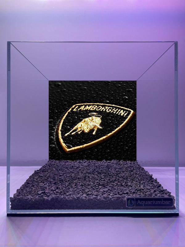 Изображение представляет собой аквариум с оформленным дном. На задней стенке аквариума изображен логотип Lamborghini, выполненный в золотистых тонах на черном фоне, имитирующем капли воды. Материал дна - темно-фиолетовые камешки. Стиль изображения можно охарактеризовать как современный, минималистичный, с акцентом на контрастных цветах и глянцевом изображении логотипа. Отсутствуют выраженные элементы художественного стиля, присущего конкретным художникам или направлениям. Визуальное исполнение соответствует тенденциям современных рекламных материалов и продукции, а также оформлению аквариумов. Средство - фотография или компьютерная графика.