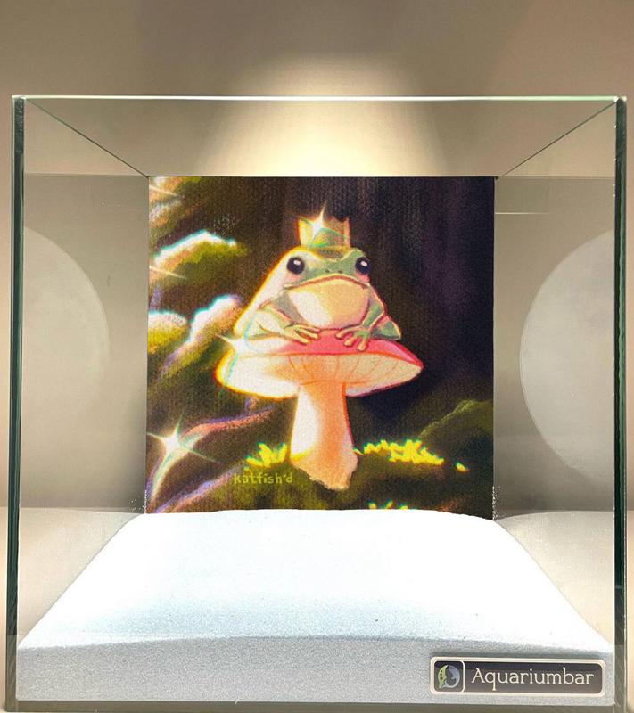 На изображении изображена картина в витрине, на которой сидит лягушка с короной на грибе. Композиция картины сфокусирована на лягушке, сидящей на большом грибе. Лягушка расположена в центре изображения. На заднем плане изображена природа, а в нижней части видны растения и деревья. Используется симметричная композиция. Главный предмет - лягушка, которая сидит на грибе. Лягушка изображена с короной на голове. Она имеет выразительные глаза и спокойное выражение лица. Гриб - яркого розово-красного цвета с белыми краями. Лягушка имеет зелёный цвет и спокойное выражение. Картина выполнена в цифровом стиле с использованием стилизованных элементов. Цвета яркие, а детализация умеренная. Стилистика произведения напоминает графику в стиле аниме или иллюстрацию. Используются мягкие пастельные цвета для окружающей среды, а более яркие цвета для основных объектов. Видно тщательное внимание к деталям, а также к свету и тени. Техника изображения тщательно продумана и детализирована. В качестве декора используется светлый поддон с белым наполнением. На заднем плане изображена природа и деревья. Световые условия мягкие и не контрастные. Общее настроение тихое, мирное и сказочное.