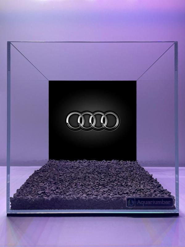 Изображение представляет собой аквариум кубовидной формы из прозрачного стекла. Внутри аквариума лежит слой тёмно-серого мелкого гравия. На задней стенке аквариума напечатан логотип автомобильного бренда "Audi". Стиль изображения можно охарактеризовать как минималистичный и современный. Цветовая палитра ограничена оттенками пурпурного и серого, что создаёт спокойную и нейтральную атмосферу. В качестве художественного приема используется контраст между гладкой поверхностью стекла аквариума и текстурой гравия. Предположительно, изображение было создано с использованием цифровых технологий. Композиция сфокусирована на аквариуме, его форме и внутреннем убранстве.