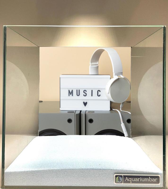 В маленьком аквариуме-дисплее, созданном для демонстрации музыкальных аксессуаров, расположились стильные наушники и небольшой световой щит с надписью "MUSIC". Все элементы выглядят аккуратно и гармонично, как будто созданы для маленького музыкального уголка.