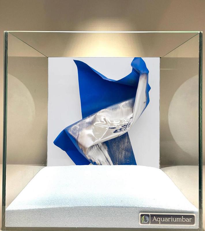 Внутри аквариумного контейнера из стекла находится абстрактная композиция из синей и серебристой формы. Композиция представляет собой произведение современного искусства. В центре композиции расположены сложные формы, складывающиеся из синего и серебристого материала. Формы объемные и замысловатые, будто они вылеплены из пластичной материи. Все элементы в аквариуме организованы в замкнутом пространстве. Они занимают почти всю поверхность внутри контейнера. Главным субъектом является абстрактная композиция, состоящая из синего и серебристого материалов, сложенных в изогнутые, волнистые формы. Синий материал кажется более плотным, чем серебристый, который имеет мягкие переходы и разводы. Это произведение, по-видимому, выполнено методом цифровой печати или живописи. Стилистика работы -- абстрактная, современная, и не имеет четко выраженных форм, но намекает на объемы и текстуры. Техника нанесения цвета и фактуры хорошо проработана. В качестве фона выступает белое поле внутри аквариума, которое создает контраст и фокусирует внимание на форме, создавая простор. Свет равномерно освещает пространство, и нет ярко выраженных теней. Общая атмосфера спокойная, сосредоточенная на созерцании абстрактных форм.