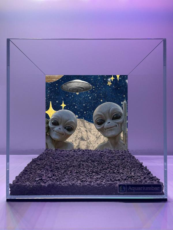 На зображенні зображена акваріумна декорація із зображенням інопланетян на тлі космосу. Композиція сцени являє собою акваріум з декоративним покриттям дна у вигляді каменів, що створює відчуття мініатюрного ландшафту. Зображення на стінці акваріума - це колаж, де інопланетяни позують на тлі пейзажу космосу, увінчаного НЛО. В цілому, композиція симетрична, з інопланетянами, розташованими посередині, а космос - це фон на стінках акваріума. На передньому плані акваріума зображені інопланетяни, їх обличчя виконані в мультяшному стилі з великими очима і посмішками. Їх фігури - це невеликі статуетки, розташовані на тлі зоряного неба. Художній стиль зображення - це колаж в мультяшному стилі. Використовуються яскраві кольори для фону, що створює барвистий акцент. Кольори для інопланетян і пейзажу гармонійно поєднуються, утворюючи цілісну картину. У технічному відношенні зображення витримано в стилі графічного дизайну. Обстановка - це внутрішня частина акваріума, оформлена в стилі космосу, з інопланетянами, що знаходяться в центрі композиції. Освітлення - нейтральне, що забезпечує візуальне сприйняття зображення без різких акцентів. Воно не впливає на настрій зображення, лише додаючи глибини до структури акваріума.