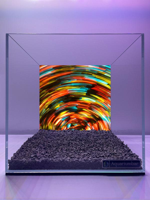 Прозрачный аквариум с дном из темного гравия, на внутренней стенке которого изображён рисунок с динамичными цветными кругами. Композиция аквариума проста и лаконична. Внутри аквариума виден слой темного гравия. На внутренней части аквариума виден динамичный абстрактный рисунок из кругов, сочетающих различные цвета (красный, оранжевый, жёлтый, зелёный, синий). Изображение на стенке создаёт эффект движения и глубины. Общее расположение элементов -- центрированное. Представленный в аквариуме субъект -- графический, абстрактный дизайн. Он представляет собой вихревое сочетание динамичных цветов, создающих впечатление движения и глубины. Художественный стиль изображения -- современный цифровой дизайн с акцентом на абстрактных формах и ярких цветах. Стиль исполнения -- технически качественный. Цветная графика выдержана в ярких, современных тонах. Креативные решения сводятся к созданию динамичного визуального эффекта, что достигается плавными переходами оттенков и ритмом цветных линий. Обстановка аквариума характеризуется использованием простого фона, созданного мягким и нейтральным цветом, и сосредоточением внимания на внутреннем изображении. Освещение, скорее всего, направлено извне, благодаря чему создаётся вид динамичности и интенсивности цвета. Темный гравий на дне аквариума усиливает ощущение глубины и контрастности. Общая атмосфера -- спокойная и умиротворённая, фокусирующая взгляд на вихревых эффектах на стенках аквариума.