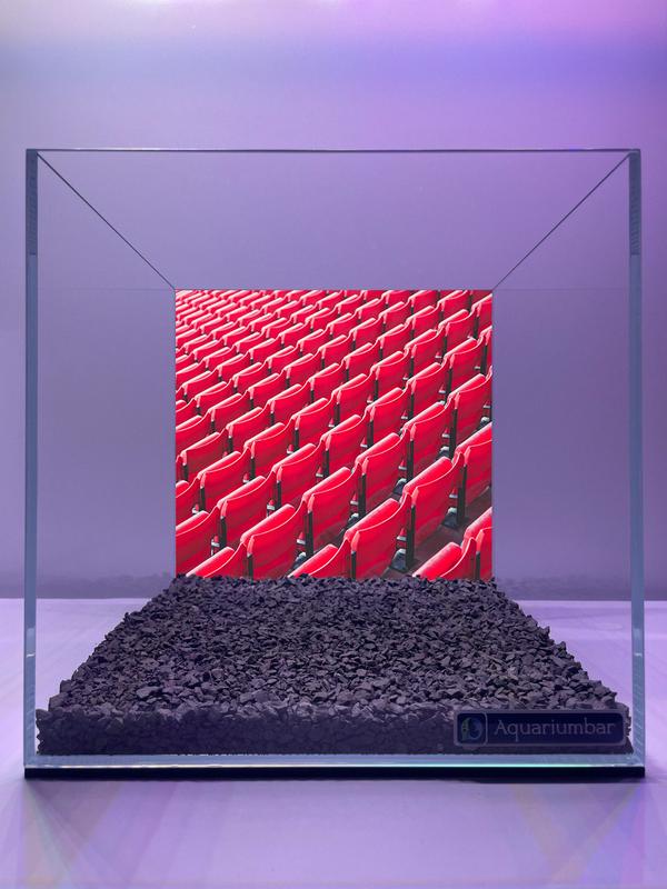 Это изображение аквариума с геометрически правильной формой. Внутри аквариума изображён вид на трибуны стадиона с красными креслами. Стиль изображения можно описать как минималистичный и концептуальный. Цветовая гамма ограничена в основном фиолетово-пурпурными оттенками, серым и темно-красным. Текстуры в изображении представлены через четкие, геометрически правильные формы аквариума, а также через текстуру и гранулометрию грунта. Использование красного цвета трибун создаёт контраст с окружающей палитрой, при этом не перегружая композицию. Средство, использованное в изображении, -- это фотография или цифровая обработка. Композиция чёткая и сбалансированная, создающая ощущение порядка и структурированности.