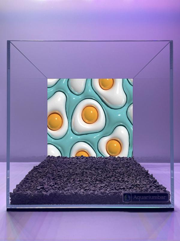 На изображении представлен аквариум с необычным оформлением задней стенки. Композиция сцены проста и лаконична. Задняя стенка аквариума оформлена в виде причудливых изображений яичницы, что придает ему оригинальность. Аквариум четко выделяется на фоне, создавая эффект изоляции. Нет действий, взаимодействий или динамики. Изображение статично. Фрагментирование элементов не заметно, композиция органично выстроена. Главный предмет -- это задняя стенка аквариума с изображением яичницы. Яйца различных форм и размеров, с желтками, создают объемную текстуру, что выделяет их на фоне. Цвет яичницы -- бирюзово-голубой, желтки -- оранжевые. Внизу аквариума размещен темный гравий. Художественный стиль изображения -- современный, абстрактный, с элементами 3D-моделирования. Используется яркая цветовая палитра. Нет сложных композиций или детализации. Техника исполнения -- цифровая живопись или фотореалистичная графика. Освещение и фон акцентированы на аквариуме. Вся атмосфера -- спокойная, нежная и сдержанная. Общее впечатление -- необычная, но привлекательная эстетика, основанная на контрасте форм и цветовой гаммы.