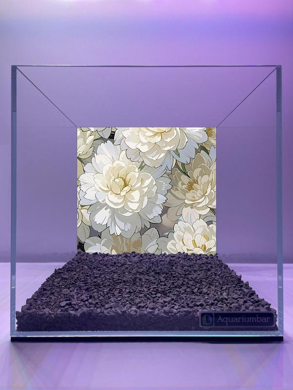 Изображение представляет собой аквариум с декоративной задней стенкой, изображающей крупный план пышных белых пионов. Стиль изображения можно охарактеризовать как декоративный, с акцентом на реалистичном изображении цветов. В изображении нет характерных мазков или техники, напоминающих определенных художников или художественные стили, такие как импрессионизм, постимпрессионизм, или традиционная китайская живопись. Цветовая палитра состоит из различных оттенков белого, кремового и пастельных серых тонов. Цветная композиция выглядит гладкой и ровной. Текстура рисунка на задней стенке аквариума ровная, напоминающая печать на бумаге или ткани, а не живописную технику. Сочинение имеет четкую структуру, с изображением цветов, размещенных симметрично в центре. В качестве материала использован фотопечать или аналогичная техника.