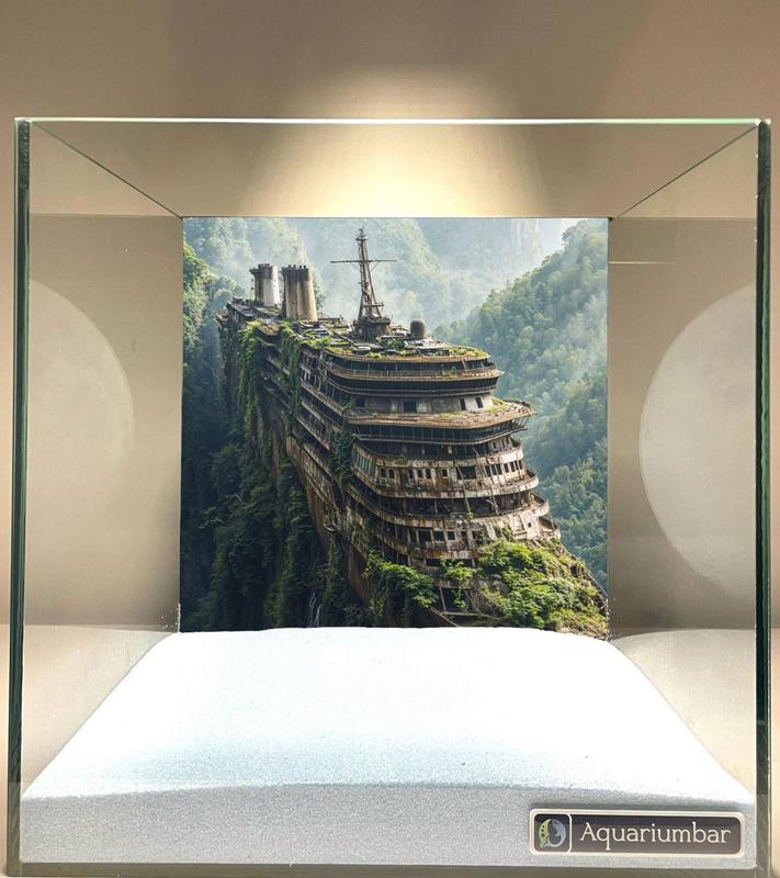 На фото изображён аквариум с изображением затонувшего корабля, покрытого растительностью, внутри стеклянной рамки. Композиция сцены основана на фотографии затонувшего корабля, окружённого густыми тропическими растениями. Изображение занимает всё пространство внутри аквариума. Оно организовано таким образом, что корабль находится в центре и занимает значительную часть композиции. Аквариум с песком на дне, в котором изображён корабль, создаёт замкнутую и гармоничную композицию. Фон аквариума создан фотосъёмкой с использованием светлых и темных оттенков, что дополняет образ старого корабля. Главным объектом изображения является заброшенный корабль, покрытый зеленью. Корабль имеет ржавый вид, что свидетельствует о длительном пребывании под водой. Тропические растения плотно обросли судно, что даёт ощущение, что корабль стал частью природы. В целом образ мрачный и ностальгический. Изображение выполнено в технике фотопечати и помещено в аквариум. Фон изображения - фото, которое отлично отображено и сохранены все детали. Отлично изображена текстура корабля и окружающей среды. Создаёт сильный и визуально привлекательный контраст. Стиль изображения реалистичный и соответствует теме. Аквариум с песком на дне создаёт впечатление, что корабль погружён в воду, что усиливает эффект погружения в атмосферу. На изображении представлен аквариум, светлый интерьер с изображением затонувшего корабля, окружённого буйной растительностью. Освещение естественное, создающее ощущение глубины и реалистичности. Впечатление, создаваемое изображением, - загадочное и таинственное. Окружающая среда естественная. Цветовая палитра преимущественно тёмная и травянисто-зелёная, что подчёркивает атмосферу заброшенности и старины. Общий тон изображения - мрачный и ностальгичный.