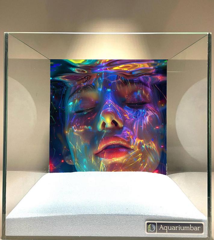 Изображение представляет собой цифровую работу, изображающую женское лицо, погруженное в воду с неоновым, красочным эффектом. Цвета яркие и насыщенные, с использованием широкой гаммы оттенков. Стиль визуализации, скорее, напоминает эффект подводного освещения. Текстура поверхности выглядит гладкой и глянцевой, напоминая поверхность воды. Композиция акцентирует внимание на лице, используя абстрактные элементы света и цвета. Изображение помещено в аквариум. Используемый метод - цифровая живопись. Нет очевидных сходств с известными художниками или художественными стилями.