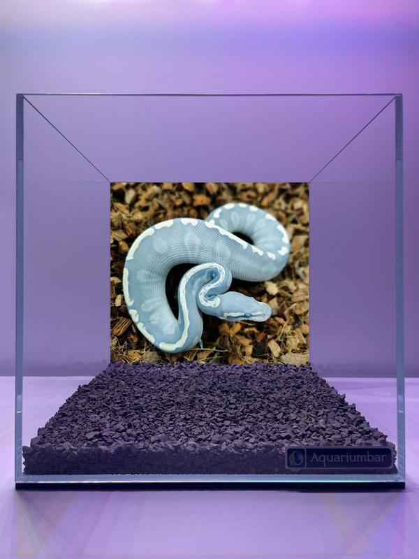 На изображении изображен аквариум с синей змеей на фоне. Композиция изображения представляет собой аквариум, занимающий центральную часть кадра. Аквариум прямоугольной формы с прозрачными стенками, заполненным темными камешками, которые имитируют естественную среду обитания. Внутри аквариума расположена синяя змея, занимающая центральное место в кадре. Змея изображена в спокойной позе, на фоне, изображающем лесную подстилку из листьев и древесных опилок. Фон аквариума выполнен в реалистичном стиле, но изображение змеи является не совсем реалистичным. На переднем плане видно, что аквариум заполнен камешками темного цвета. В нижней части кадра, на основании аквариума, размещен логотип "Aquariumbar". Главным объектом на изображении является синяя змея. Она изображена в спокойном положении и занимает большую часть центральной части аквариума. Змея имеет характерные для своего вида особенности, но цвет избыточно насыщенный и интенсивный, что отходит от реалистичного восприятия. Вид змеи реалистичен, но цвет, вероятно, усилен для эстетического эффекта. Используется техника цифровой живописи, сочетающая фотографическое изображение змеи с цифровым оформлением и фоном. Обработка изображения реалистична, но цвет змеи кажется более интенсивным и не естественным, что придаёт ему определённый художественный стиль. Стилистика изображения комбинирует реализм с видоизменёнными элементами. Окружающая среда создаёт атмосферу спокойствия и умиротворения. Использование темных камешков, естественного фона и синей змеи создаёт впечатление спокойствия, умиротворения и погружения в природу. Имитация естественной среды обитания подчеркивает реалистичность изображения и передаёт ощущение природной среды.