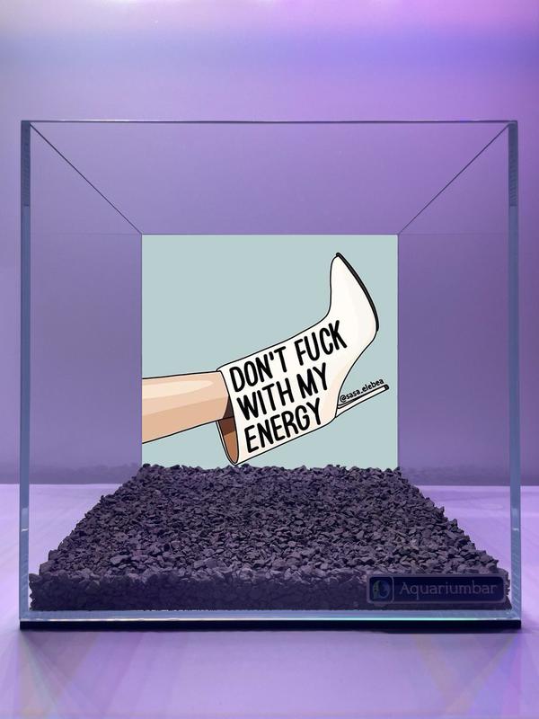 Зображення являє собою графічний дизайн, розміщений всередині акваріума. Стиль зображення можна охарактеризувати як сучасний, з елементами коміксів або аніме/манга. Використовуються плоскі кольори і прості лінії. Кольорове тло в пастельних тонах, можливо, світло-сіре або світло-блакитне. На передньому плані зображено ногу зі взуттям, написом «DON'T FUCK WITH MY ENERGY» на білому тлі. Використовуваний інструмент для створення зображення, схоже, цифровий, імовірно оброблений графічним редактором. Композиція зображення проста, але ефектна, з акцентом на зображенні взуття і посланні. Використовуються плоскі, непрозорі кольори.