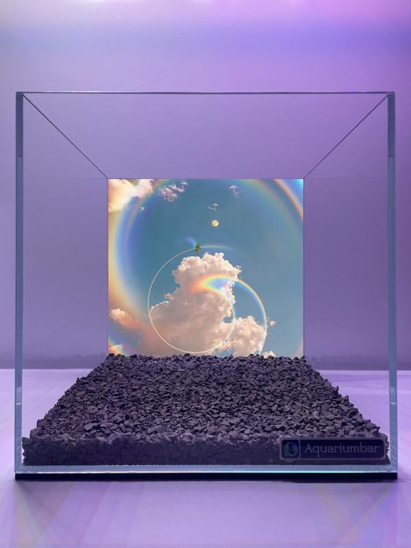 На фото изображена аквариумная композиция с изображением неба, облаков и радуг внутри аквариума. Композиция изображения создает иллюзию пейзажа внутри аквариума. Изображение неба, облаков и радуг, наложенное на стенки аквариума, создает эффект глубины. Внизу изображен слой темного гравия. Композиция симметричная, с фокусом на центр аквариума. Главный объект -- изображение неба с облаками, радугами и маленьким облаком с каким-то маленьким предметом на нем. В центре композиции находятся два соединенных круга, похожих на радуги. В аквариуме нет никакой живности. Изображение создано с помощью цифровой графики. Стиль изображения - нереалистичный, с использованием ярких цветов и нечетких границ. Используются различные оттенки синего и фиолетового, которые добавляют в атмосферу волшебства. Цветовая палитра яркая и насыщенная. В аквариуме светло-фиолетовый фон с сине-фиолетовым свечением сверху, создающий атмосферу сказки и магии. Освещение мягкое и равномерное, а фон плавно переходит от светлых оттенков к более темным. Общие цветовые тона светлые, создавая впечатление легкой и нежной атмосферы.