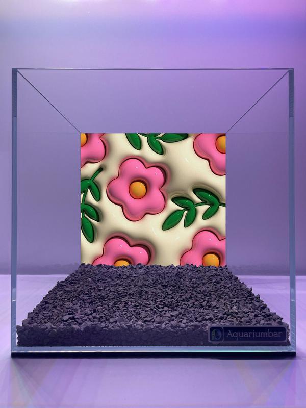 На изображении изображен аквариум с декоративным покрытием в виде розовых цветов на белом фоне. Композиция изображения представляет собой аквариум, в котором передняя часть заполнена темным гравием, а задняя - цветочным орнаментом. Орнамент состоит из розовых цветов с желтыми серединками, расположенными на белом фоне, с зелеными листьями и ветками. Композиция изображения проста и прямая, фокус сосредоточен на цветочной картине, которая выступает в качестве центрального элемента. Изображение аквариума, как ключевого элемента, занимает центральную часть. Он расположен прямо на фоне. Гравий в передней части аквариума имеет темно-серый оттенок. Орнамент задней части аквариума выдержан в нежных оттенках, создавая визуальный баланс. Художественная реализация изображения проста. Цветы и листья на фоне аквариума имеют яркие и чистые цвета, которые выглядят как декоративный рисунок. Используются простые геометрические формы и четкие линии. Стилистика изображения современная и, возможно, декоративная. В изображении нет очевидного окружения или условий освещения, которые влияют на общую атмосферу или настроение. Это закрытый, изолированный мир, сосредоточенный на визуальном представлении декоративного цветочного орнамента.