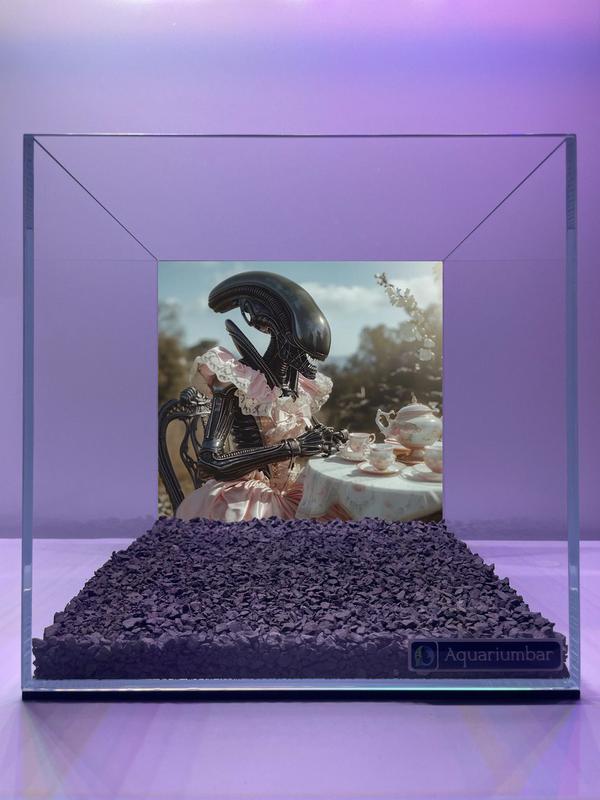 Изображение представляет собой аквариум с фотографией, изображающей инопланетянина, сидящего за столом для чаепития. Стиль изображения можно охарактеризовать как сюрреалистический и нереальный. Общий стиль изображения - это сочетание фотореализма и дизайна, характерного для арт-проектов. Отсутствуют явные черты известных художников или художественных движений. Изображение представляет собой фотопечать, которая размещена в аквариуме на фоне темного грунта. Цветовая палитра изображения умеренная, с преобладанием пастельных тонов, придающих сюрреалистический акцент образу. Текстура изображения гладкая и фотореалистичная. Композиция изображения симметрична и центрирована. Изображение создано с использованием технологии цифрового редактирования, что ощущается в отсутствии выраженных кистевых мазков. Средство создания - фотопечать, вставленная в аквариум.