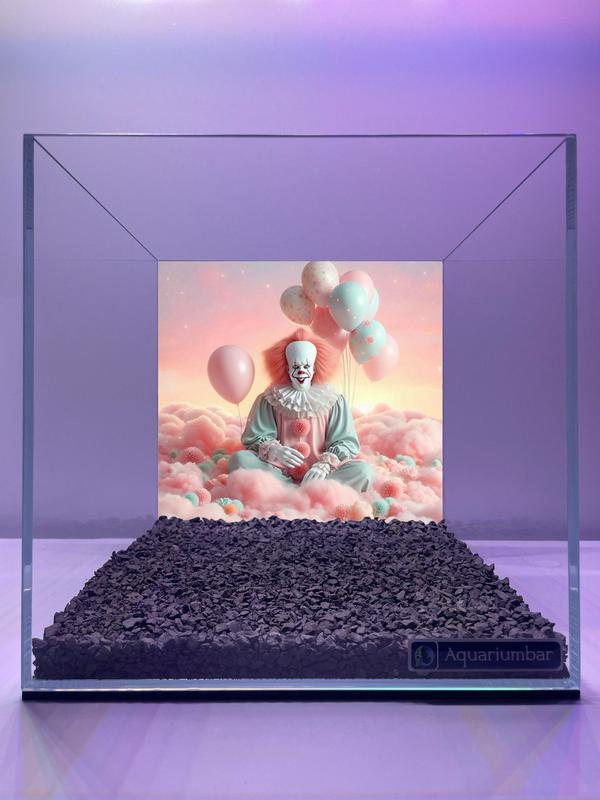 Изображение представляет собой аквариум с декоративным оформлением. Внутри аквариума находится изображение клоуна, сидящего на облаках розового цвета. Клоун окружён воздушными шариками пастельных тонов. Фон - нежно-розовые облака и закат. Цветовая гамма мягкая и пастельная, с преобладанием розовых и пастельно-голубых оттенков. Образ клоуна, кажется, сочетает в себе элементы реализма и мультяшной стилизации. Композиция изображения центрирована и сфокусирована на клоуне. Оформление аквариума дополнено декоративным покрытием из тёмно-серых камешков. Стиль изобразительного оформления в целом не относится к конкретным художникам или стилям, скорее это современная цифровое оформление.