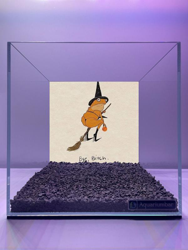 Однажды лягушка сказала: «Хватит». Она встала из болота, натянула шляпу, схватила метлу и, не попрощавшись, сказала: «Bye, bitch». Она не летит в теплые края. Она летит в новую себя. Ее попа не просит похудеть, ее взгляд не ищет одобрения. У нее есть тыковка, палочка и внутренний феминизм уровня «просто жить как хочу». Этот куб -- не о лягушке. Это -- революция минимального уважения к себе в одной иллюстрации. Это акт побега, где вместо трагедии -- смех. И вместо покаяния -- магия и четко сформулированное прощание. Aquariumbar сохранил этот момент в стекле, потому что некоторые вещи стоит сохранять: - Как мем. - Как заклинание. - Как напоминание, что иногда лучше всего -- просто уйти с улыбкой. -