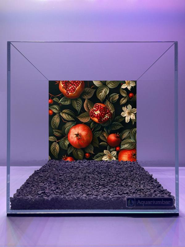Изображение представляет собой аквариум с декоративной наклейкой, изображающей гранаты на ветвях растений. Стиль изображения напоминает классические ботанические иллюстрации, возможно с примесью винтажного стиля. Цветы и листья имеют четкие контуры, с реалистичными деталями, а гранаты изображены с яркими красными оттенками. Общая цветовая палитра -- спокойная, с темно- зелеными, коричневыми и серыми оттенками фона, и яркими тонами гранатов. Композиция симметричная, а изображение гранатов и цветов создает гармоничный узор. Материал, скорее всего, печатается на прозрачной пленке, которая затем размещается внутри аквариума. На переднем плане изображен темно-серый песок. Детали выполнены с точностью и реализмом, что создает впечатление высокого качества изображения. Видно, что рисунок напечатан, а не написан вручную. Стиль не похож ни на один из названных известных стилей, как Ван Гог, Моне, Хокусай или Чжан Дацянь.