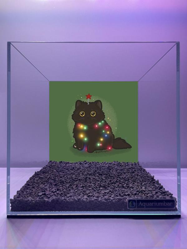 Изображение представляет собой изображение черного кота, украшенного гирляндами нарисованными в стиле аниме/манга. Кот изображен на зеленом фоне в аквариуме. Стиль изображения напоминает иллюстрации в детских книгах или графических романах, с использованием простых, но выразительных линий и ярких цветов. Отсутствуют сложные тени или глубокие детали. В целом, изображение имеет симпатичный и праздничный вид, ориентированный на детей. Используется плоский цвет, без использования сложных градиентов. Композиция простая, кот расположен в центре изображения, а фон однотонный, не отвлекая внимания от основного объекта. Видимо, изображение напечатано на стекле аквариума или создано как наклейка для аквариума.