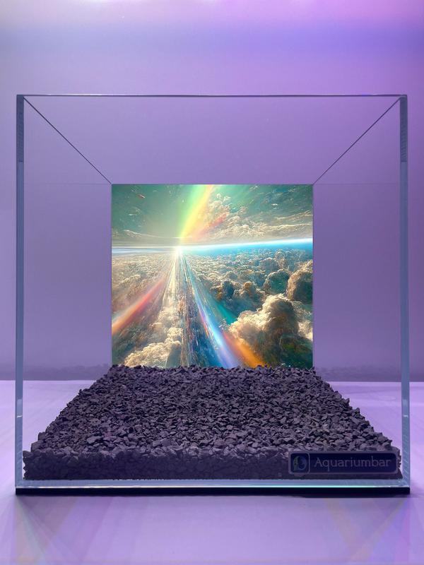 Изображение представляет собой аквариум с красочной нарисованной композицией, изображающей радугу и облака, простирающиеся по горизонтали. Стиль можно охарактеризовать как комбинацию пейзажа с элементами популярных художественных стилей и визуальных эффектов, а также с акцентом на ярких цветах и реалистичной цветовой палитре. В целом, композиция изображает небесные пейзажи, которые привлекают взгляд яркой цветовой гаммой и использованием плавных переходов. Техника рисования подразумевает использование цифровых инструментов с реалистичными эффектами и представлением понятных визуальных образов. Материал изображения -- цифровая обработка.