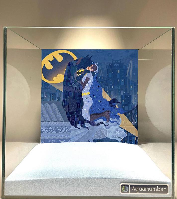 Изображение представляет собой произведение искусства, стилизованное под мозаику. На нём изображены персонажи Бэтмен и Женщина-кошка, обнимающиеся на фоне ночного города. Цветовая гамма преимущественно сине-голубая, с оттенками серого и темно-синего. Стиль напоминает как графическую иллюстрацию, так и элементы мозаики или кубизма. В изображении используется техника разделения на мелкие фрагменты различных цветов, создающие ощущение сложной мозаики. Поверхность рисунка кажется плоской, без выраженной текстуры. Композиция сфокусирована на парах героев, обрамлённых ночным пейзажем. Материал рисунка скорее всего цифровой, хотя детали изображены таким образом, чтобы напоминать традиционную живопись.