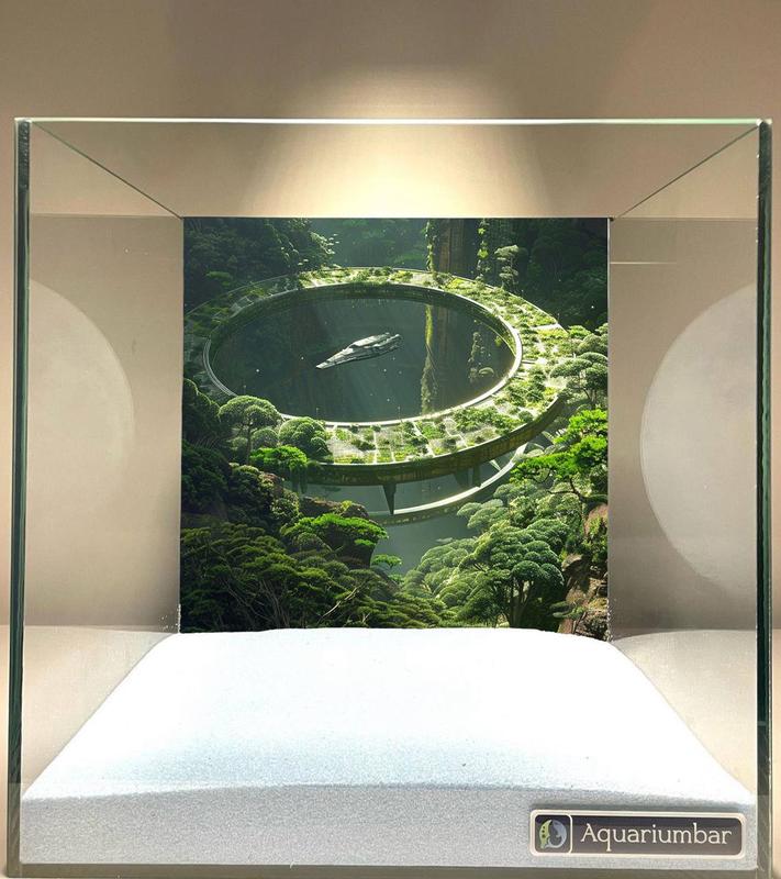 На изображении виден аквариум, оформленный как миниатюрная фантастическая экосистема, с круглым кольцом зеленых растений и структур, похожих на мост, над водной гладью. Композиция изображения отличается симметрией и центрированностью. Круглый дизайн центрального элемента является основным фокусом, создавая иллюзию пространства и глубины. Фон состоит из красочных изображений растительности, придавая ощущение растительного кольца. В целом, композиция уравновешенная, направленная на визуальную привлекательность. Ключевым элементом является круглый ландшафт, созданный из растительности и мостоподобных структур, который занимает центр изображения. Он расположен в центре, и цвета элементов изображены с использованием насыщенных и сочных оттенков, создавая ощущение гармонии и глубины. Художественный стиль изображения похож на фотографию высококачественного изображения, обработанного для создания детализированной структуры и живых цветов. Изображение тщательно проработанное, а цвета сочные и естественные. Нет стилистических или технических несоответствий. Настройка изображения представляет собой аквариум с оформлением под декоративный природный ландшафт. Световые условия естественные, подчеркивающие детали и создающие приятную атмосферу. Общий вид изображения производит впечатление покоя и гармонии, создавая ощущение спокойствия.