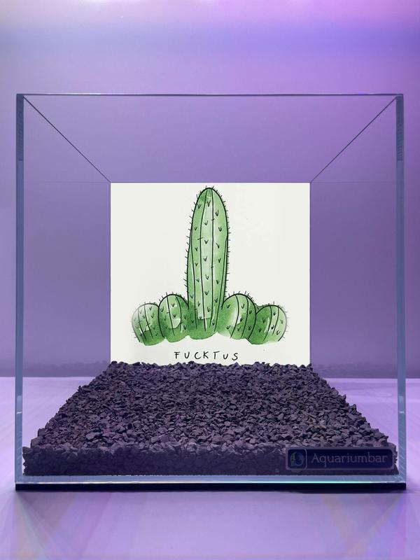 Изображение представляет собой аквариум с нарисованным кактусом. Стиль изображения -- простой, графический, с элементами акварели. Цветовая палитра включает нежные зелёные и фиолетовые оттенки. Кактус изображён в простой манере, с акцентом на деталях, а не на реалистичном изображении. В целом, стиль напоминает современное иллюстрационное искусство, с отсутствием глубокой драматизации или сложной композиции. Использование кактуса в качестве предмета и присутствующее слово "FUCKTUS" делают изображение провокационным. Средство рисунка - похоже на цифровую графику с акварельным эффектом. Композиция простая, кактус расположен в центре, а окружение аквариума простое, в стиле плоского рисунка.