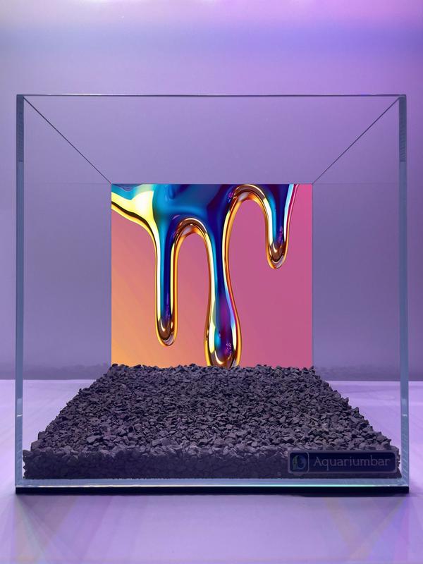 На фото изображена аквариумная композиция с разноцветной, капающей жидкостью. Композиция построена в виде куба, в центре которого виднеется жидкость, стекающая вниз. Акцент смещен на жидкость, которая капает и окрашена в радужные цвета. Внутри куба виден серый грунт. Стеклянный куб, как рамка, имеет нейтральный оттенок, позволяя эффектно выделять жидкость. Ключевым элементом является радужная жидкость. Она стекает каплями с верхней части композиции. Жидкость имеет множество оттенков, переходящих друг в друга. У нее наблюдается блеск. Внизу, под жидкостью, находится слой серого грунта. Работа выполнена с помощью компьютерной графики, что видно по качеству изображения, плавности переходов цветов и формы капель жидкости. Используются яркие цвета и контрастные сочетания. На заднем фоне наблюдаются плавные переходы оттенков. Среда создает абстрактную атмосферу. Композиция наполнена энергией, динамикой и визуальным интересом. Цвета и формы напоминают современный дизайн и красоту. Освещение в целом равномерное, позволяя рассмотреть и оценить детали изображения.