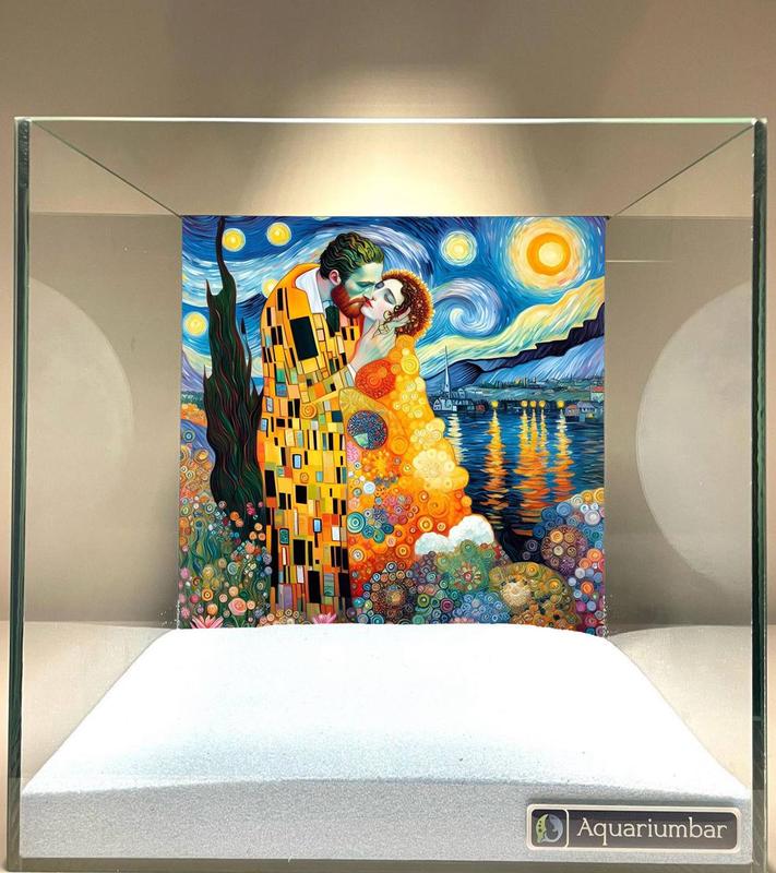 Изображение представляет собой репродукцию картины «Поцелуй» (или «Поцелуй») австрийского художника Густава Климта. Стиль репродукции напоминает современную технику репродукции картин, с применением цифровых технологий. Цвета насыщенные, используется широкая палитра оттенков желтого, оранжевого, синего и красного. Характерная мозаичная техника и стиль «Климта» сохранены, также присутствуют элементы стиля «Звёздная ночь» Винсента ван Гога в изображении звездного неба. Состав композиции не меняется от оригинала, и сохраняет главный акцент на поцелуе пары. В данном случае репродукция нанесена на стеклянную панель, расположенную внутри аквариума, что придает ей эффект сочетания искусства и дизайна интерьера. Средство, похоже, не художественная живопись в традиционной форме, а скорее, печать или цифровая обработка, применённая для изображения.