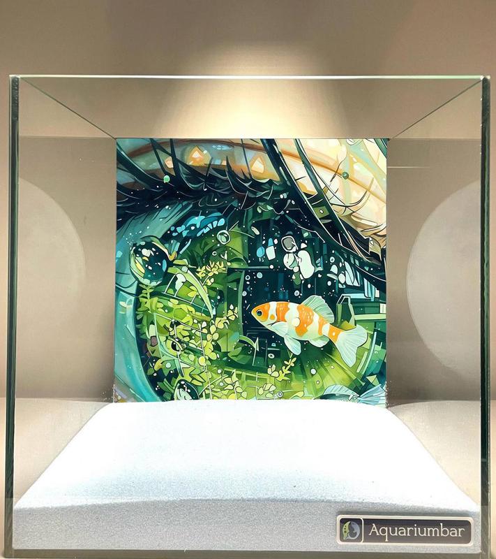 На изображении изображён аквариум, оформленный в виде иллюстрации, на которой изображена картина подводного мира с рыбками и морскими обитателями, будто нарисована внутри глаза. Композиция построена в виде аквариума, где центральным элементом является изображение подводного мира. Иллюстрация создает эффект погружения зрителя в подводный пейзаж. Объекты расположены таким образом, что они создают ощущение глубины и пространства аквариума. Кадры запечатлены так, что акцентируют внимание на изображении подводного мира. Основные объекты -- это разнообразные рыбы, черепахи, растения и другие элементы подводного мира, изображённые с использованием различных цветов и техник. Они реалистично передают подводный мир, детализированно прорисованы и расположены естественно в аквариуме. Иллюстрация выполнена в стиле цифрового искусства или аниме, с яркими цветами и детализированным изображением. Использованы мягкие переходы цветов, что создает ощущение глубины и пространства. Иллюстрация имеет стилистику и детализацию, характерную для аниме. Техника исполнения профессиональная и аккуратная. Среда изображения - аквариум. Подсветка и цвета акцентируют атмосферу подводного мира, создавая впечатление погружения. В иллюстрации используется тёплая цветовая гамма, которая усиливает ощущение умиротворения и спокойствия. Общее настроение - спокойное и таинственное, как подводный мир.