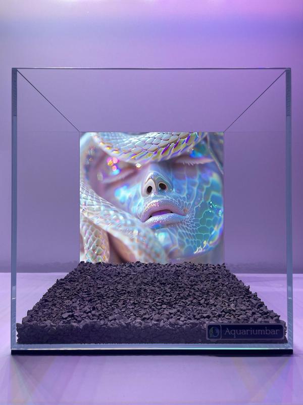 Изображение представляет собой аквариум с изображением женщины, чья кожа имеет переливающиеся, радужные цвета. Стиль изображения - цифровой, с элементами фотореализма и арт-стилизации. Визуально заметна обработка, направленная на создание эффекта мерцания и переливов, напоминающих радугу или драгоценные камни. Цветы, узоры и текстуры на изображении женщины выглядят как изысканные узоры, созданные с помощью компьютерной графики. Цветовая палитра преимущественно пастельная, с преобладанием фиолетовых, сиреневых и синих оттенков. В изображении использован эффект глубины, и акцент сделан на создании визуального интереса. Текстуры и поверхности на изображении обработанные, и создается иллюзия, как будто кожа человека покрыта чешуей. Композиция изображения сосредоточена на лице женщины и изящно смотрится внутри аквариума. Использование аквариумной емкости и камней на дне создает дополнительную контекстуальную атмосферу и глубину композиции. Средство изображения - цифровая обработка изображений.